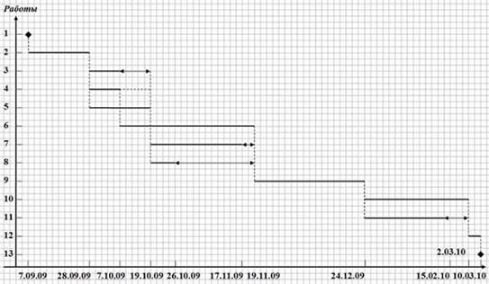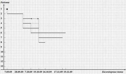После выполнения расчетов откладываем на календарном плане линии продолжительности работ. При этом веха обозначается ромбиком. Каждая работа соединяется с предшественниками пунктирной линией. Результат данного этапа календарного планирования приведен на рис.2.13.