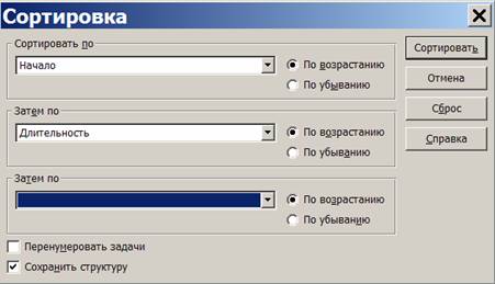Сортировка таблицы позволяет упорядочить ее строки в соответствии со значением некоторого поля базы данных проекта, в том числе и поля, не отображенного в таблице. По умолчанию таблицы отсортированы по идентификатору (поле Ид). Для сортировки предназначен пункт меню Проект/Сортировка, в котором раскрывается подменю, состоящее из нескольких типовых вариантов сортировок, доступных в текущей таблице. Состав предлагаемых вариантов сортировки зависит от самой таблицы. Например, таблицу ввода данных диаграммы Ганта можно сортировать по датам начала и окончания, по приоритету, затратам и идентификатору задач. В том случае, когда среди предложенных вариантов сортировки нет подходящего, в списке вариантов имеется пункт Сортировать по, при помощи которого можно выполнить многоуровневую сортировку, учитывая значения до трех полей. Окно параметров сортировки изображено на рис. 4.3. Флажок Сохранять структуру позволяет сортировать строки только внутри фаз (если он снят, выполняется сортировка по всему проекту). Для отмены результатов сортировки нужно выполнить сортировку по идентификатору или отменить действие (Правка/Отменить сортировку, кнопка