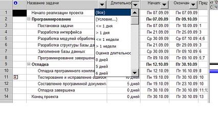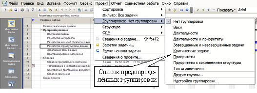 Рис. 4.10. Выбор предопределенной группировки В качестве примера используем группировку Длительности в диаграмме Ганта проекта «Разработка программного комплекса». В результате все работы оказываются разделенными на группы по значению длительности задачи, а в таблицу добавляются заголовки групп, выделенные желтым цветом (рис. 4.11).