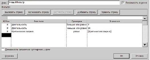 Для отмены установленного предопределенного фильтра служит пункт Проект/Фильтр/Все задачи (Все ресурсы). Определенный пользователем фильтр используется в том случае, когда не подходит ни один из предыдущих способов фильтрации. Например, условие отбора содержит больше двух условий, накладываемых на значение столбца таблицы. Для создания фильтра нужно выбрать пункт Проект/Фильтр/Другие фильтры, в открывшемся диалоге установить тип фильтра (задачи или ресурсы) и нажать кнопку Создать. Окно создания фильтра изображено на рисунке 4.8. На нем изображено описание фильтра, отбирающего критические задачи с длительностью от 7 до 14 дней. Это окно имеет флажок Показывать в меню, установка которого помещает созданный фильтр отдельным пунктом меню системы.