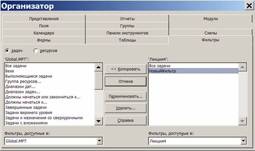 Удаление ранее созданного фильтра выполняется в пункте Проект/Фильтр/Другие фильтры. В открывшемся окне следует нажать кнопку Организатор, найти в правом списке название удаляемого фильтра, выделить его и нажать кнопку Удалить (рис. 4.9).