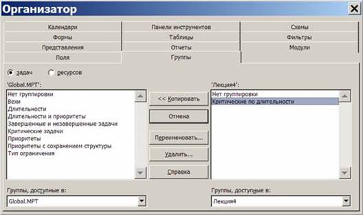 Для удаления группировки из проекта необходимо воспользоваться Организатором: Проект/Группировка/Другие группировки/Организатор. В его окне (рис. 4.14) правый список содержит ранее определенные группировки. Для удаления выделяется название группировки и нажимается кнопка Удалить.