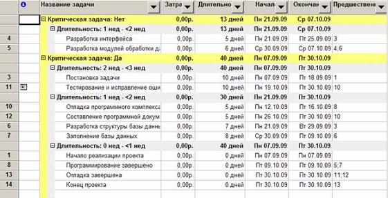 Рис. 4.29. Результат применения группировки 7. Отменить действие группировки – Проект/Группировка/Нет группировки. 8. Удалить созданную группировку. f. Проект/Группировка/Другие группы. g. Нажать кнопку Организатор. h. В правом списке выделить название КритическаяДлитель-ностиПоНеделям. i. Нажать Удалить и подтвердить удаление. j. Закрыть окно организатора и окно Другие группы. k. Убедиться, что удаленная группировка отсутствует в списке пункта меню Проект/Группировка .