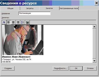 Рис. 5.4. Вкладка Заметки окна свойств ресурса На вкладке Настраиваемые поля отображаются значения определенных в проекте настраиваемых полей ресурсов.