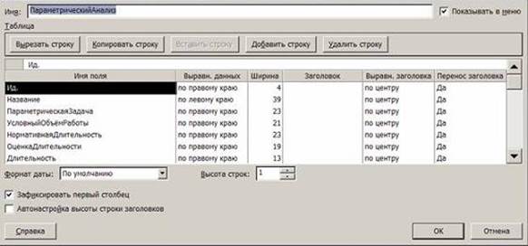Параметрический анализ заключается в том, что имеется некоторый показатель, характеризующий задачу или ресурс, который требуется проанализировать менеджеру проекта. Для реализации параметрического анализа используется одно или несколько настраиваемых полей, при помощи которых вычисляется значение такого показателя. Далее столбец соответствующего настраиваемого поля помещается в таблицу представления задач или ресурсов и выполняется собственно анализ путем сравнения значений или выполнения операций фильтрации, группировки или сортировки данных. Приведенная схема имеет слишком общий вид. Поэтому в качестве примера рассмотрим параметрический анализ длительностей задач. Вопрос оценки длительности задачи имеет важное значение с точки зрения качества планирования проекта. При заниженной длительности исполнителям не хватит времени для ее успешного завершения, в результате фактическая длительность и затраты превысят плановые показатели. Это, в конечном счете, приведет к более позднему завершению проекта и увеличению его бюджета. Завышенная длительность приведет к недозагруженности ресурсов, их нерациональному использованию и неэффективной растрате бюджета. Чтобы правильно оценить длительность задачи, менеджер должен обладать некоторым опытом в области планирования и управления релевантными проекту технологическими процессами. Однако, для некоторых задач существует способ ее оценки, опирающийся на некоторые показатели или характеристики этих задач. Например, длительность кладки стены зависит от количества кирпича (или площади стены), настила полов – от площади пола, ввода данных – от количества элементов данных и т.д. Для таких случаев и используется параметрический анализ длительности. Основной его идеей является назначение задачам некоторого параметра, который назовем УсловныйОбъемРаботы. Кроме него для задачи вводится параметр НормативнаяДлительность, значение которого равно длительности выполнения одной единицы условного объема. Тогда оценку длительности задачи можно рассчитать как произведение условного объема на нормативную длительность. Для реализации параметрического анализа нужно выполнить определенную последовательность действий. 1. Создать настраиваемое поле типа Флаг и назвать его ПараметрическаяЗадача. Это поле должно иметь значение Да для тех задач, длительность которых должна рассчитываться параметрически, и Нет для остальных. 2. Создать настраиваемое поле типа Число и назвать его УсловныйОбъемРаботы. 3. Создать два настраиваемых поля типа Длительность и назвать их НормативнаяДлительность и ОценкаДлительности. 4. Для поля ОценкаДлительности создать формулу, в которой перемножаются УсловныйОбъемРаботы и НормативнаяДлительность. 5. Создать таблицу представления с именем ПараметрическийАнализ, включив в нее поля Ид, Название, ПараметрическаяЗадача, УсловныйОбъемРаботы, НормативнаяДлительность, ОценкаДлитель. Окно создания таблицы представления изображено на рис. 6.4.