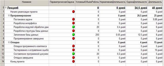 6. Переключиться в представление Диаграмма Ганта и выбрать таблицу ПараметрическийАнализ. Заполнить значение поля ПараметрическаяЗадача для всех задач проекта. 7. Заполнить поля УсловныйОбъемРаботы и НормативнаяДлительность для параметрических задач. 8. Сравнить столбцы ПараметрическаяДлительность и Длительность и при необходимости изменить значения в последнем. При желании можно установить фильтр по полю ПараметрическаяЗадача, который отображает только задачи со значением Да этого поля. Таблица ПараметрическийАнализ изображена на рис. 6.5. В примере значения флага ПараметрическаяЗадача обозначаются графическими индикаторами красного (Нет) и зеленого (Да) цвета.