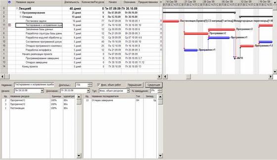 Анализ показывает, что задачи Разработка структуры базы данных и Заполнение базы данных являются рискованными, поскольку их выполняет только неопытный сотрудник Программист1. Трудовые ресурсы с большим объемом трудозатрат также представляют определенный фактор риска. Если некоторый работник участвует в большом количестве задач, особенно критических, и несет повышенную ответственность в проекте, то его непредвиденная недоступность (болезнь, увольнение) может нанести значительный ущерб проекту на этапе выполнения. Для анализа риска используем представление АнализРисков, созданное в предыдущем случае. В верхней его части в Лист ресурсов добавим столбец Трудозатраты и назначим фильтр, отображающий только трудовые ресурсы. Отсортируем таблицу по убыванию трудозатрат. В нижней части представления выберем диаграмму Ганта. Результат изображен на рис. 6.23. Из анализа делаем вывод, что распределение трудозатрат по работникам примерно одинаково, но Программист2 имеет наивысшие трудозатраты и занят исключительно в критических задачах. Поэтому его участие в проекте наиболее ценно и имеет наивысший риск.