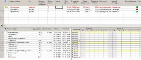 Результат сортировки и окончательный вид представления изображен на рис. 6.19. К наиболее рискованным задачам могут быть отнесены Постановка задачи, Тестирование и исправление ошибок и Составление программной документации. Однако, первая и третья используют только один трудовой ресурс и несколько материальных и затратных. Поэтому их нельзя отнести к рискованным. В задаче же Тестирование и исправление ошибок задействованы все три работника проекта, в связи с чем ее отнести к рискованным можно.
