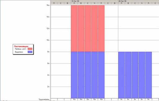 Лист ресурсов позволяет найти перегруженные ресурсы, но не дает информации о том, когда, при выполнении каких задач и насколько они перегружены. Величину и периоды перегрузки можно определить при помощи представления График ресурсов, выбрав для отображения в нем перегруженный ресурс и параметр Трудозатраты (рис.7.3). Трудозатраты, находящиеся в пределах установленной нормы, изображаются синим цветом, а превышающие норму – красным. Из рисунка видно, что Постановщик имеет перегрузку с 19 по 23 октября 2009г, а объем суточного превышения трудозатрат равен 8ч.