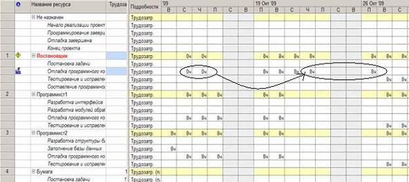 3. Перебросим эти трудозатраты с 14 и 15 октября на 22 и 26 октября. В строке Отладка программного комплекса обнулить его трудозатраты за 14 и 15 октября. В результате объем трудозатрат Постановщика для этой задачи временно упадет. 4. Впишем трудозатраты в объеме 8ч 22 и 26 октября. 5. Результат – первый период перегрузки ресурса Постановщик ликвидирован и он начинает работы 19 октября, когда становится доступным (например, приезжает из отпуска). Результат выравнивания изображен на рис.7.20.