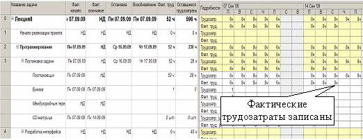 Столбцы правой таблицы представления соответствуют выбранным периодам времени (по умолчанию – дни), а строки содержат значения запланированных и фактических трудозатрат в эти периоды как для ресурса в целом, так и для каждой конкретной задачи. Ввод повременных данных выполняется именно в строку фактических трудозатрат. Трудозатраты трудовых ресурсов вводятся в часах, материальных – в единицах конкретного вида материала, затратных – в рублях. Строка запланированных трудозатрат соответствует текущему плану, а строка фактических – фактическому плану. Как отмечалось выше, текущий план всегда приводится в соответствие с фактическим в уже выполненной части работ. Поэтому на рис. 8.7 в дни, за которые фактические данные уже введены, плановые и фактические трудозатраты совпадают и равны фактическим. Например, если ввести цифру 3 в выделенную ячейку, то объем запланированных трудозатрат изменится с 8 до 3. Недоработанные трудозатраты автоматически переносятся на конец периода выполнения задачи, увеличивая тем самым ее длительность. Наоборот, переработанные трудозатраты снимаются с конца этого же периода, уменьшая тем самым длительность задачи. Ввод повременных данных задач выполняется в представлении Использование задач после предварительной его настройки: 1. отобразить таблицу Отслеживание; 2. в правой таблице отобразить строки Трудозатраты и Фактические трудозатраты. После настройки представление имеет вид, изображенный на рис. 8.8.