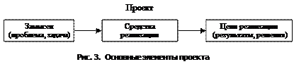 В настоящее время в экономической литературе существует ряд определений термина «проект», каждое из которых имеет право на существование в зависимости от конкретной задачи, стоящей перед специалистами или организациями. Классическое определение проекта впервые было представлено PMI: «проект – временное усилие или предприятие, предназначенное для создания уникального продукта или услуги». В русском языке проект может означать совокупность технической документации, чертежей и расчетов, необходимых для создания объекта. В том случае, когда в качестве результатов реализации проекта выступают некоторые физические объекты (производственные комплексы, здания, сооружения и т.п.) определение проекта может быть конкретизировано следующим образом: проект – целенаправленное, заранее проработанное и запланированное создание или модернизация физических объектов, технологических процессов, технической и организационной документации для них, материальных, трудовых, финансовых и иных ресурсов, а также управленческих решений и мероприятий по их выполнению. В Кодексе знаний об управлении проектами под проектом понимается некоторая задача с определенными исходными данными и требуемыми результатами (целями), обусловливающими способ ее решения. Проект включает в себя замысел (проблему), средства его реализации (решения проблемы) и получаемые в процессе реализации результаты (рис. 3). В науке и практике менеджмента проектом является изменение исходного состояния любой системы (например, предприятия), связанное с затратами времени и ресурсов. Процесс такого изменения осуществляется по заранее разработанным планам с учетом финансовых и временных ограничений.