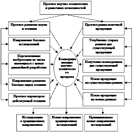 Рис. 23. Прогноз научно-технических и рыночных возможностей Прогноз развития науки и техники показывает направление базовых и новых исследований, перспективы их развития, применение новых изобретений в разрабатываемых объектах, расширение рынков сбыта, а также когда и какой объем выпускаемой техники необходимо реализовать определенной группе потребителей в течение указанного периода времени.