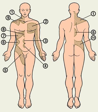 Рисунок 356. Схема расположения зон Захарьина-Геда на туловище и конечностях. В указанных зонах могут появляться боль и гиперестезия при заболеваниях легких и бронхов (1), сердца (2), кишечника (3), мочевого пузыря (4), мочеточников (5), почек (6), печени (7 и 9), желудка и поджелудочный желеэы (8), мочеполовой системы (10).