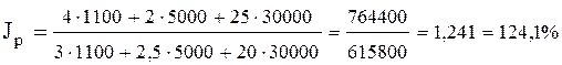 Вывод: В отчетном периоде по сравнению с базисным количество проданного товара А снизилось на 26, 7% или на 400 л., по товару В физический объем реализации увеличился на 66, 6 % или на 2000 кг, а по товару С – на 50% (в 1, 5 раза) или на 10 000 шт. 3. Как изменились цены по трем товарам вместе? Используя формулу (7), определим общий индекс цен: