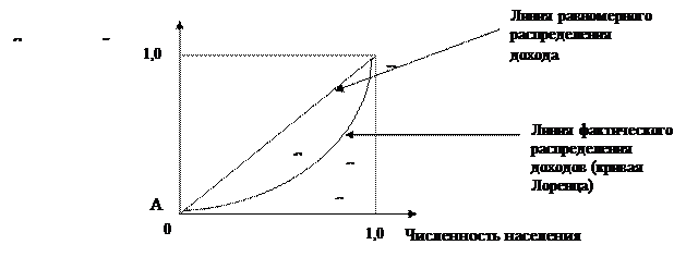Рис. 7.1. Кривая Лоренца Коэффициент Джини изменяется в интервале от 0 до 1. В случае полного равенства в распределении доходов коэффициент Лоренца равен 0, а при полном неравенстве – 1. По данным 2006 года индекс Джини в России – 41%, что на 0, 4% выше, чем в 2005 г.. Таким образом, сохраняется высокая степень расслоения общества. Среди стран Евросоюза самый низкий коэффициент Джини в Дании – 24, 7%. В Германии он составляет 28, 3%, во Франции – 32, 7%. Для измерения уровня бедности устанавливается порог денежных доходов, ниже которого лица или домохозяйства считаются имеющими недостаток средств для обеспечения стоимости жизни, определяемой минимальными потребностями. Таким образом, уровень бедности − это удельный вес населения с доходами ниже прожиточного минимума. В 2007 г. 21, 6 млн. россиян имели среднедушевой доход ниже официально установленного прожиточного минимума в 3809 рублей, что составило 15, 8 % всего населения страны. Величина прожиточного минимума в соответствии с Федеральным законом от 24 октября 1997 г. №134-ФЗ «О прожиточном минимуме в Российской Федерации» представляет собой стоимостную оценку потребительской корзины, а также обязательные платежи и сборы. Прожиточный минимум исчисляется по различным социально-демографическим группам населения (трудоспособное население с разбивкой по полу и возрасту), пенсионеры, дети двух возрастных групп (0-6 лет и 7-15 лет), а также по регионам России по формуле: A=B+C+D+E, где А – величина прожиточного минимума; В – стоимость минимальной продовольственной корзины: С − стоимостная оценка потребления непродовольственных товаров; D − стоимостная оценка расходов на платные услуги; E – расходы на налоги и обязательные платежи. Последние три компоненты рассчитываются, исходя из структуры затрат на эти цели 10% наименее обеспеченного населения. Величина прожиточного минимума в целом по Российской Федерации определяется ежеквартально и устанавливается Правительством Российской Федерации. На основе данных о доходах бедного населения рассчитывается показатель дефицита дохода, равный суммарному доходу населения, недостающему до величины прожиточного минимума. Для анализа динамики уровня бедности в стране могут быть исчислены два показателя: индекс глубины бедности и индекс остроты бедности. Индекс глубины бедности: Индекс остроты бедности: