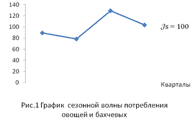 Для анализа сезонности потребления овощей и бахчевых и прогноза их среднемесячного потребления по кварталам на предстоящий год исчислите: 1. индексы сезонности потребления методом простой средней; 2. постройте график сезонной волны; 3. осуществите прогноз потребления овощей и бахчевых по кварталам предстоящего года с учетом сезонности, если их годовое потребление в среднем на члена домохозяйства предполагается в объеме 78 кг. Сделайте выводы. Решение задачи 17: 1. Для выполнения расчетов составим вспомогательную таблицу: