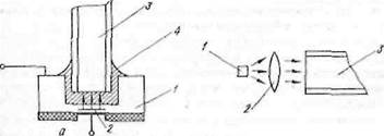 Мал. 10.7. Введення випромінювання в світлопровід; а - бездіодна система U - кристал світлодіоду; 2 –активна випромінювана область; 3 - рахівник; 1 - оптичний клей); б -с допомогою фокусуючої лінзи (/-излучатель; 2 - фокусуючий елемент)