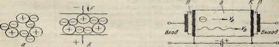 На рис.10.10 показана схема такого підсилювача на об'ємних хвилях. На торцях напівпровідникового звукопроводу (3) розташовані п'єзоелектричні напівпровідникові перетворювачі (П), які з допомогою контактів (К) приєднані з одного боку до звукопроводу, а з іншої - до вхідних і вихідних клем. При подачі на вхід змінної напруги у вхідному пєзостворювачі збуджується акустична хвиля, яка поширюється по звукопроводу. Взаємодія хвилі з рухомими в тому ж напрямі по напівпровідниковому звукопроводу електронами забезпечує її посилення. Для пояснення цього явища розглянемо мал. 10.11. Передбачимо, що в звукопровод вводиться гармонійна подовжня акустична хвиля, рухома із швидкістю Vb- Тиск Р в кристалі при цьому від крапки до крапки міняється. У тих місцях, де кристал стискується (Р> 0), э. д. з (Е) уповільнює рух електронів, а в тих місцях, де розтягується, - прискорює. В результаті цього на початку кожного періоду хвилі утворюються згустки електронів. При Уе> Vb згустки рухаються в гальмівних ділянках хвилі і передають їй свою енергію, чим і забезпечується посилення. Подібні акустоэлектронные підсилювачі можуть давати вихідну потужність сигналу порядка декілька ватів, маючи смугу пропускання до 300 Мгц. Їх об'єм (у мікроелектронного виконання) не перевищує 1 см3.