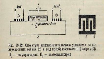 поверхневих хвилях. Структура такого підсилювача показана на мал. 10.12, а. потужністю вхідного гратчастого пьезопреобразователя (мал. 10.12, би), напилюваного на поверхню п'єзоелектричного кристала Па, в останньому збуджується акустична хвиля. На деякій ділянці поверхня иьезокристаллаї стикається з поверхнею напівпровідникової пластини, в якій від джерела Е проходит струм. Отже, на ділянці поверхневого контакту пьезо-кристалла і напівпровідника станеться взаємодія акустичної хвилі з потоком електронів. Саме на цій ділянці відбувається акустичне посилення сигналу', який потім знімається у вигляді посиленої змінної напруги з вихідного преобра-зователя, зворотного п'єзоефекту, що працює в режимі. Гідність ЕАУ поверхневого типа полягає в тому,, що матеріали пьезоэлектрика і напівпровідника можуть бути різними. Перший з ник повинен володіти высокими- п'єзоелектричними властивостями, другий - забезпечувати високу рухливість електронів. В- якості напівпровідникового шару в подібних підсилювачах використовують зазвичай кремнієвий монокристал' я-тииа.толщиной близько' 1 мкм\ вирощений на сапфіровій підкладці эпи.таксиаль-ным. способом. Цей матеріал має питомий опір порядку 100'Ом • см і рухливість носіїв заряду до5О0 см.