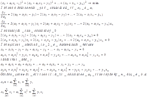 Коэффициент регрессии и свободный член теоретически можно определить с помощью метода наименьших квадратов. Рассмотрим самый простой случай – линейную однофакторную модель. Известны значения х и