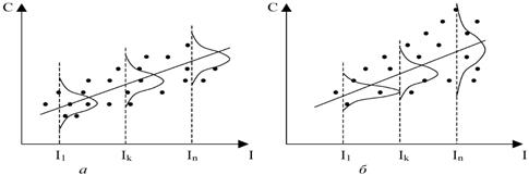 При проведении регрессионного анализа, основанного на методе наименьших квадратов, на практике следует обратить серьезное внимание на проблемы, связанные с выполнимостью свойств случайных отклонений моделей. Как мы отмечали ранее, свойства оценок коэффициентов регрессии напрямую зависят от свойств случайного члена в уравнении регрессии. Для получения качественных оценок необходимо следить за выполнимостью предпосылок МНК, т. к. при их нарушении MIIK может давать оценки с плохими статистическими свойствами. Одной из ключевых предпосылок МНК является условие постоянства дисперсий случайных отклонений. Выполнимость данной предпосылки называется гомоскедастичностью (постоянством дисперсии отклонений). Невыполнимость данной предпосылки называется гетероскедастичностъю (непостоянством дисперсий отклонений). Необходимо выяснить суть гетероскедастичности, ее причины и последствия, а рассмотреть способы смягчения этих последствий. При рассмотрении выборочных данных требование постоянства дисперсии случайных отклонений может вызвать определенное недоумение в силу того, что при каждом i-м наблюдении имеется единственное значение ошибки e i. Откуда же появляется разброс? Дело в том, что при рассмотрении выборочных данных мы имеем дело с конкретными реализациями зависимой переменной у i, и соответственно с определенными случайными отклонениями e i. i = 1, 2..... n. Но до осуществления выборки эти показатели априори могли принимать произвольные значения на основе некоторых вероятностных распределений. Одним из требований к этим распределениям является равенство дисперсий. Данное условие подразумевает, что несмотря на то что при каждом конкретном наблюдении случайное отклонение может быть большим либо маленьким, положительным либо отрицательным, не должно быть некой априорной причины, вызывающей большую ошибку (отклонение) при одних наблюдениях и меньшую - при других. Однако на практике гетероскедастичность не так уж и редка. Зачастую есть основания считать, что вероятностные распределения случайных отклонений e i при различных наблюдениях будут различными. Это не означает, что случайные отклонения обязательно будут большими при определенных наблюдениях и малыми – при других, но это означает, что априорная вероятность этого велика. Поэтому важно понимать суть этого явления и его последствия. На рис. приведены 2 примера линейной регрессии – зависимости потребления С от дохода I: