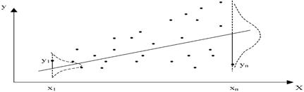 Из рис. видно, что для каждого конкретного значения xi\ СВ X переменная Y принимает значение уi из некоторого множества, имеющего свое распределение, отличное одно от другого в силу непостоянства дисперсий. По МНК минимизируется сумма квадратов отклонений. Но в этом случае каждое конкретное значение е i2 имеет одинаковый " вес" вне зависимости от того, получено оно из распределения с маленькой дисперсией или с большой. Но это противоречит логике, т. к. точка, полученная из распределения с меньшей дисперсией, более точно определяет направление линии регрессии. Поэтому она должна иметь больший " вес", чем точка из распределения с большей дисперсией. Следовательно, методы оценивания, учитывающие " веса" точек наблюдений, позволяют получать более точные (эффективные) оценки. Учет " весов" точек характерен, например, для метода взвешенных наименьших квадратов, рассматриваемого ниже.