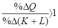 Также по карте изоквант можно определить возрастающий и убывающий эффект от масштаба производства. Возрастающий имеет место если: убывающий - неизменный - Эффект масштаба можно определить по сумме коэффициента эластичности в производственной функции Кобба - Дугласа: Q = A * Kб * Lв, где А – коеффициент пропорциональности, К – затраты капитала, L – затраты труда, б и в – коэффициенты эластичности, которые показывают на сколько % изменится объем выпуска при изменении затрат капитала (коэффициент эластичности б) и затрат труда (коэффициент эластичности в) на 1%. Если б + в > 1 – возрастающий эффект от масштаба. Если б + в < 1 – убывающий эффект от масштаба. Если б + в = 1 – неизменный. Для определения оптимальной комбинации ресурсов следует совместить карту изоквант с изокостой. Изокоста – показывает различные комбинации двух ресурсов, которые может приобрести производитель при имеющихся средствах (линия равных издержек).