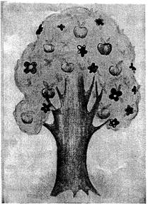Рис. 2. Второй рисунок Анжелы Е.А. Толчинская На третьем рисунке изображено яблоневое дерево с цветами и плодами. Крона нежно-зеленого цвета, яблоки — золотисто-желтые, а цветы — розовые и пурпурные. Рисунок передает ощущение чувственного полнокровия, представление о плодородии и благодати. Мощный ствол производит впечатление устойчивости, хорошей связи с землей и в то же время — устремленности ввысь. Татьяна П. (беременность 30 недель, третий ребенок) при создании работы на тему «Мой ребенок» (рисунок 4) использовала основные цвета (красный, желтый, синий). Хотя рисунок, на первый взгляд, имеет отвлеченно-символический характер, на нем угадывается изображение детородного органа с плацентой (более крупный элемент композиции снизу, изображенный всеми тремя основными цветами), а также самого ребенка (округлый элемент композиции сверху, изображенный желтым цветом). Связь между матерью и ребенком представлена в виде устремленной ввысь конструкции в виде треугольника розового цвета. Обращают на себя внимание размытые контуры элементов рисунка, нежное «перетекание» одного цвета в другой при сохранении их чистоты и полупрозрачности. Возможно и иное «прочтение» символических элементов рисунка.