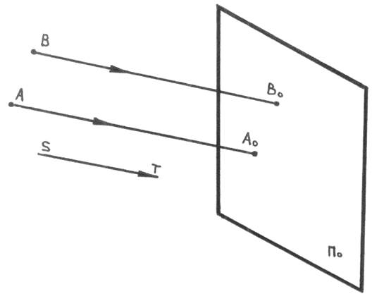 Образование проекций Правила построения изображений, излагаемые в начертательной геометрии, основаны на методе проекций. Рассмотрение метода проекций начинают с построения проекции точки, так как при построении изображения любой пространственной формы рассматривается ряд точек, принадлежащих этой форме. Задаем плоскость проекций П0 и точки А и В (рис. 1.3.1). Проведем из них проецирующие лучи параллельно заданному направлению проецированию ST. Точки пересечения этих лучей с плоскостью П0 (А0 и В0 ) будут параллельными проекциями точек А и В.