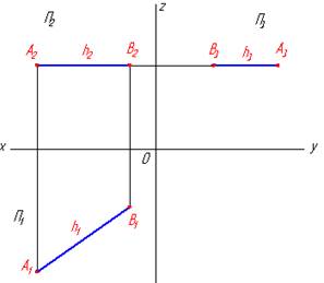 Рис. 2.2.4. Три проекции профильной прямой Анализируя проекции прямых на рис. 2.2.2, 2.2.3 и 2.2.4 можно сделать вывод, что если проекция прямой параллельна оси проекции, то рядом расположенная проекция этой прямой на соседней плоскости проекции будет проецироваться в натуральную величину. Проецирующие прямые - являются перпендикулярными к плоскостям проекций (горизонтально, фронтально и профильно проецирующие прямые). Горизонтально - проецирующая прямая (рис. 2.2.5) перпендикулярна горизонтальной плоскости П1 и проецируется на нее в точку, а на П2 и П3 без искажения. Фронтальная и профильная проекции горизонтально - проецирующей прямой равны ее натуральной величине.