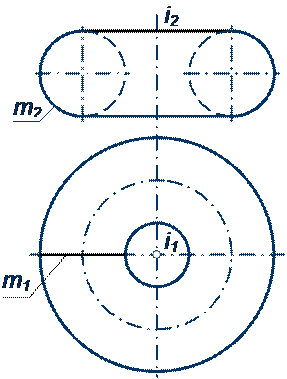 На рис. 5.7.4 приведён комплексный чертёж открытого тора, заданного образующей окружностью m и осью вращения i. На комплексном чертеже очерком поверхности для плоскости П1 является проекции экватора и горла, а для плоскости П2 – проекция главного меридиана (две образующие окружности).