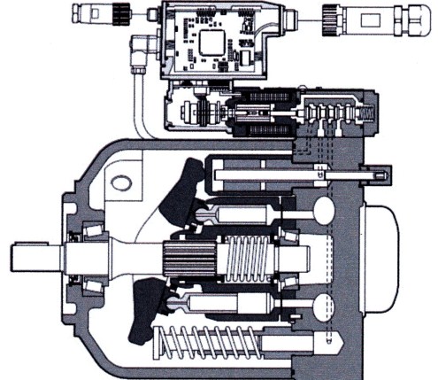 Рис. 1. Насос с пропорциональным электроуправлением фирмы Atos В условиях значительных усилий и скоростей, требований высокой точности и хорошей динамики, наличия больших пиковых нагрузок и температур наибольшее применение находят регулируемые аксиально-поршневые насосы с наклонным диском мод. A10VSO (номинальное давление рном = 28 МПа, пиковое рпик = 35 МПа, рабочий объём Vо = 10...140 см3).