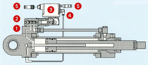 Рис. 9. Сервоцилиндр AZP фирмы Atos: 1 - цилиндр 2 - пропорциональный гидрораспределитель 3 - драйвер 4 - кабель позиционного датчика обратной связи 5 - кабели питания и соединения с шиной