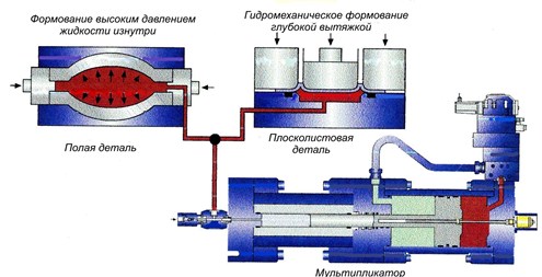Рис. 20. Технология гидроформования фирмы Bosch Rexroth Новое решение допускает управление потоками до 10 000 л/мин (Δ р = 2, 5 МПа) при времени срабатывания 15...20 мс. Инновационная технология гидроформования фирмы Bosch Rexroth основана на использовании мультипликаторов CHP2 и CНР4 с рабочим объёмом 1, 38...7, 85 л и давлением 200 и 400 МПа. Мультипликатор содержит позиционный датчик поршня, пропорциональный гидрораспределитель и клапанный блок (рис. 20). Специальный датчик высокого давления (жидкость HFA) обеспечивает точную высокодинамичную регулировку замкнутого контура управления. Одним из перспективных направлений развития гидропривода являются средства малой механизации, в том числе создаваемые в ЗАО «ЭНЕРПРОМ». Номенклатура изделий, рассчитанных в основном на давление 70 МПа, включает разнообразные домкраты, цилиндры, оборудование для железнодорожного транспорта и производства стропов, прессы, перфораторы, съёмники, мобильные насосные установки с электро- или бензоприводами, ручные насосы, гайковёрты, гидравлические гайки, мультипликаторы, гидроаппараты, инструменты для кабелей, трубогибы, стенды и инструменты для ремонта автомобилей и подвижного состава, аварийно-спасательное оборудование, установки для извлечения обсадных колонн при нефтедобыче и многое другое. По данным фирмы Moog в Германии быстро развивается электрогидравлическая сервотехника для ветрогенераторов. Сравнительно недавно были созданы новый режущий инструмент - высоконапор-ная гидроабразивная струя воды - и соответствующая технология гидроструйной резки. Теперь это уже 5-координатная прецизионная обработка сложнопрофильных деталей на гидрофицированном станке с давлением, превосходящим 600 МПа.