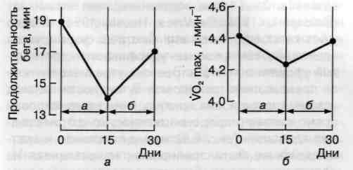 Рис. 1. Розвиток процесів деадаптації (а) і реадаптації (б) після припинення та поновлення тренувальних занять бігунами (Houston et al., 1979) Важливим є і те, що деадаптациія протікає нерівномірно: в перші тижні після припинення тренування спостерігається значне зниження функціонального резерву адаптованої системи, надалі процес деадаптації сповільнюється. У прихованому вигляді адаптаційні реакції зберігаються тривалий час і слугують основою для більш швидкого відновлення втраченого рівня адаптації при поновленні тренування після тривалої перерви в порівнянні з часом, витраченим на початкове формування адаптації (Пшеннікова, 1986). Важливо враховувати й те, що чим швидше формується адаптація, тим складніше утримується досягнутий рівень і тим швидше вона втрачається після припинення тренування. Зокрема, період згасання сили після припинення її тренування прямо пов'язаний з тривалістю формування адаптації: чим інтенсивніше і короткочасніше було тренування, спрямоване на розвиток сили, тим більш швидке її згасання при припиненні регулярних занять (Мак-Комаса, 2001). Часте чергування процесів адаптації та деадаптації призводить до надмірної експлуатації генетично детермінованих здібностей до формування ефективних пристосувальних змін в організмі. Слід пам'ятати, що підтримання структурних основ адаптації за допомогою помірних фізичних навантажень набагато сприятливіше, ніж багаторазове повторення циклів «деадаптації – реадаптація». Багаторазова активація біосинтезу, необхідна для багатократного відновлення втраченого рівня адаптації, може призвести до своєрідного локального зношування органів, що входять в систему, відповідальну за адаптацію (Меерсон, 1986). Слід визнати, що ця точка зору має під собою вагомі підстави, незважаючи на наявність великого експериментального матеріалу, що свідчить про досить швидке відновлення втраченого рівня адаптації після поновлення ефективного тренування.
