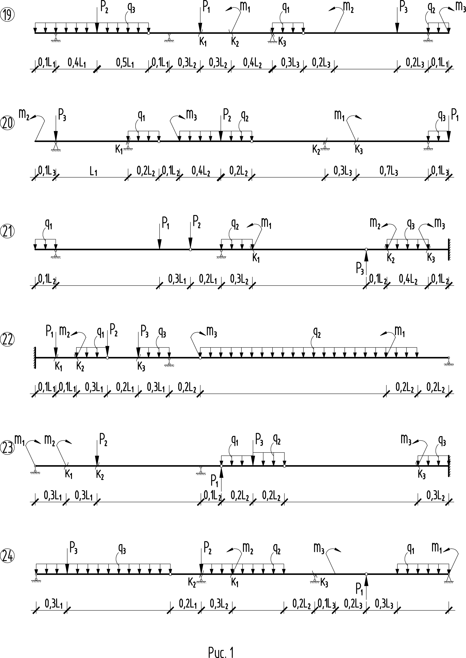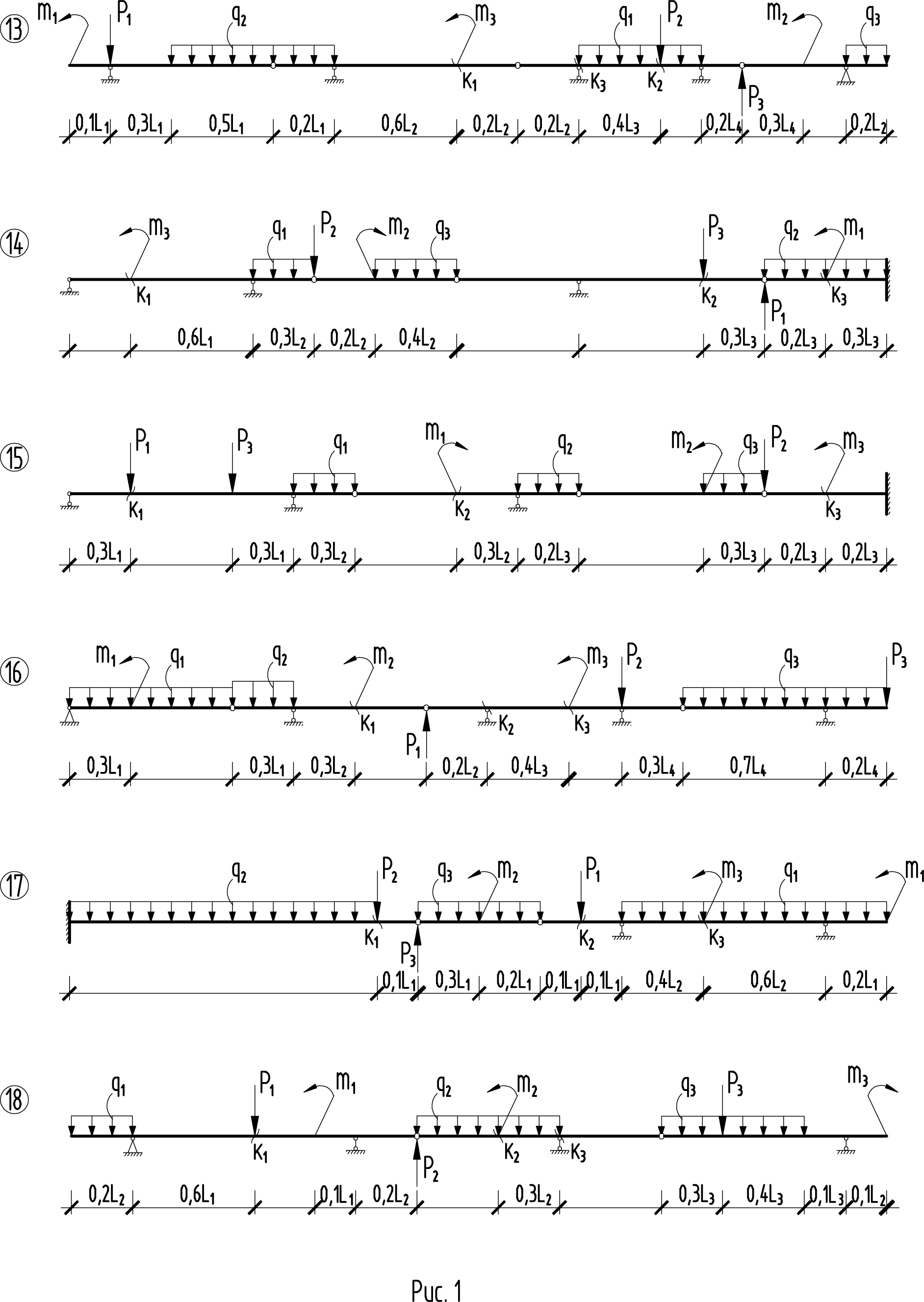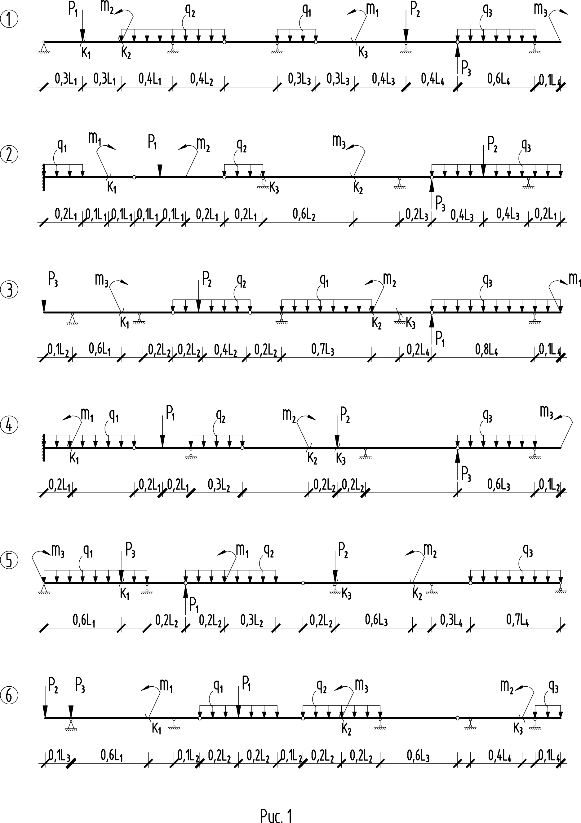 Задание. Для балки, выбранной согласно таблицы 1 и варианту (рис. 1) требуется: 1. Проверить геометрическую неизменяемость составной многопролетной балки. 2. Показать поэтажную схему. 3. Для всех простых и консольных балок поэтажной схемы построить эпюры поперечных сил и изгибающих моментов от действия неподвижной нагрузки. 4. Построить эпюры Q и M для заданной составной балки. 5. Построить линию влияния одной из опорных реакций промежуточной опоры (по выбору студента). 6. Построить линии влияния поперечных сил и изгибающих моментов для сечений, указанных по шифру в табл. 1. 7. Пользуясь построенными линиями влияния, определить значения опорных реакций, Q и M для рассмотренных сечений при действии заданной неподвижной нагрузки. 8. Сравнить результаты вычислений Q и M в сечениях, а также одной реакции, выполненных аналитически и по линиям влияния. Таблица 1.