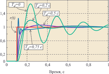 На рис. 5.42 показано влияние постоянной дифференцирования на форму отклика замкнутой системы на скачок . Уменьшение амплитуды колебаний и увеличение коэффициента затухания с ростом постоянной дифференцирования объясняется тем, что благодаря положительному наклону АЧХ в области (см. рис. 5.36) уменьшается сдвиг фаз в контуре регулирования.
