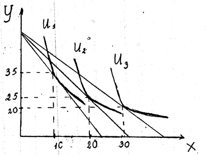 Визначити монопольний обсяг, монопольну ціну і монопольний прибуток будь-яким методом. Побудувати графік і показати розмір прибутку. 15. Нахил кривої попиту на холодильники у всіх точках 0, 5. Розрахувати коефіцієнт еластичності попиту якщо при ціні 2500 грн. було продано 1000 шт.? 16. На ринку зошитів установилася рівновага при ціні 4 гр.од. за штуку та обсязі реалізації 18 шт. Коефіцієнт еластичності попиту – 0, 05, коефіцієнт еластичності пропозиції + 0, 1. Функція попиту та пропозиції прямолінійні, визначить нову ціну рівноваги, якщо попит знизився на 10%. 17. Функція попиту на товар “Х” QДх=800-Рх+0, 4Ру Ціна товару “Х” Рх=400 гр.од., ціна товару “У” Ру=500 гр.од. Визначити коефіцієнт прямої та перехресної еластичності попиту на товар “Х”. 18. Еластичність попиту за доходом дорівнює 3/2, за ціною 19. Використовуючи карту кривих байдужості та бюджетних ліній, накресліть криву попиту на товар Х, якщо РХ1=15 гр.од.; РХ2=10 гр.од.; РХ3=5 гр.од.