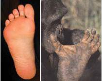 - У обезьян в стопе нет свода! При ходьбе наша стопа благодаря своду амортизирует все нагрузки, сотрясения и удары. Известно, что ни у одного животного нет пружинящего свода стопы. Если человек произошел от древних обезьян, то свод у него должен был появиться в стопе «с нуля». Однако пружинящий свод – это не просто маленькая деталь, а сложнейший механизм. Без него наша жизнь была бы совсем другой. Только представьте себе мир без прямохождения, спорта, игр и длительных прогулок! При передвижении по земле обезьяны опираются на наружный край стопы, сохраняя равновесие с помощью передних конечностей.