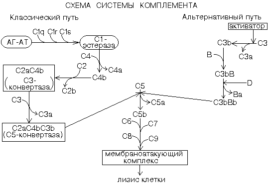 Отличие альтернативного пути от классического заключается в том, что для его запуска не нужно образования иммунных комплексов. Пусковым механизмом альтернативного пути является образование С3b из С3 под действием какого-либо пускового фактора: например, полисахаридов бактериальной клеточной стенки. С3b образует комплекс с фактором " В" (С3bB), который подвергается действию протеазы D (всегда активна в плазме крови!). В результате отщепляется " Ва" и образуется комплекс С3bBb, который обладает протеолитической активностью в отношении С5 - отщепляет от него С5а. После этого реакции протекают так же, как и в классическом пути. Субстратом для С3b является и С3, в результате чего образуется еще большее количество С3b - наблюдается положительная обратная связь. Поэтому достаточно даже небольших количеств С3bBb, чтобы получать все больше и больше его активной формы (усиление первично слабого сигнала). Альтернативный путь в норме работает всегда и очень активно, что обеспечивает быстрый неспецифический ответ на внедрение чужеродных клеток. В регуляции работы системы комплемента принимают участие специфические ингибиторы, которые регулируют скорость работы ферментов ключевых реакций.