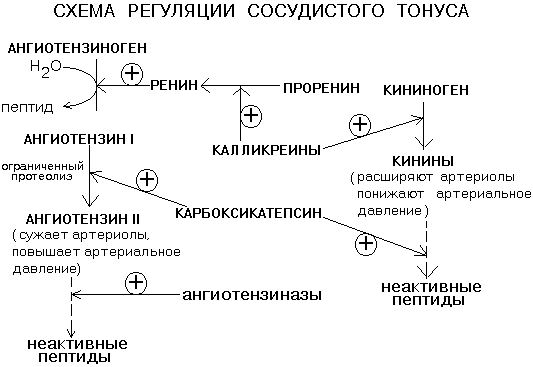 Выработка ренина зависит от кровоснабжения почек. Поэтому при снижении артериального давления выработка ренина увеличивается, а при повышении - снижается. При патологии почек иногда наблюдается повышенная выработка ренина и может развиваться стойкая гипертензия (повышение артериального давления). Ренин-ангиотензин-альдостероновая система работает в тесном контакте с другой системой регуляции сосудистого тонуса: КАЛЛИКРЕИН-КИНИНОВОЙ СИСТЕМОЙ, действие которой приводит к понижению артериального давления. В почках синтезируется белок кининоген. Попадая в кровь, кининоген под действием сериновых протеиназ - калликреинов превращается в вазоактивные пептиды - кинины: брадикинин и каллидин. Брадикинин и каллидин обладают сосудорасширяющим эффектом - понижают артериальное давление. Инактивация кининов происходит при участии карбоксикатепсина - этот фермент одновременно влияет на обе системы регуляции сосудистого тонуса, что приводит к повышению атериального давления. Ингибиторы карбоксикатепсина применяются в лечебных целях при лечении некоторых форм артериальной гипертензии.
