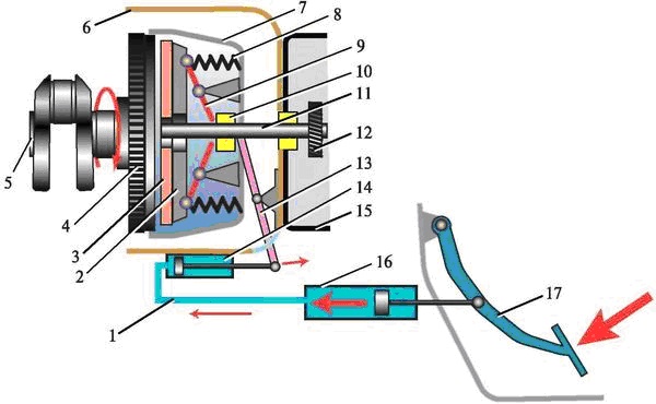 Дальнейшее изучение автомобиля невозможно без понимания термина " привод". Попробуем раз и навсегда с этим разобраться. В обычной жизни человек самостоятельно, посредством своих ног и рук, перемещается по улице и квартире, прилагает усилия и передает их окружающим предметам. Что-то открывает и закрывает, включает и выключает, и все это без применения всяких там трубопроводов и рычагов. И совсем другое дело в автомобиле. Когда надо передать усилие от водителя к некому механизму или от одного агрегата к другому, то без " посредников" не обойтись. Ведь в машине все надежно закреплено в различных местах кузова, и водитель не имеет возможности на ходу выйти из-за руля, чтобы, допустим, руками приоткрыть дроссельную заслонку карбюратора. Поэтому в автомобиле существует привод механизмов. Представьте ситуацию, когда вам необходимо постоянно что-то закрывать и открывать, а сами вы передвигаться не можете. Если трудно себе это представить, тогда для начала привяжите себя покрепче к своему любимому дивану. А теперь попробуйте открыть входную дверь! Для передачи усилия на расстоянии по " открыванию" и " закрыванию" двери вам придется применить веревку или палку, дистанционное управление или еще что-нибудь. Пусть это будет длинная палка, привязанная веревками одним концом к вашей руке, а другим к ручке двери. А дальше дерзайте - тяните и толкайте, впуская к себе по одному толпу приглашенных в гости друзей. В этом случае палка с веревками и будут являться тем " приводом", который передает усилие на расстоянии. В автомобиле практически каждый механизм имеет свой привод, посредством которого он приводится в действие. Привод может состоять из большого количества отдельных узлов и деталей, может быть механическим, гидравлическим или иным. Привод выключения сцепления (гидравлический) состоит из (рис. 35): При нажатии на педаль сцепления усилие ноги водителя через шток и поршень передается жидкости, которая, в свою очередь, передает давление от поршня главного цилиндра на поршень рабочего цилиндра. Далее шток рабочего цилиндра перемещает вилку выключения сцепления и нажимной подшипник, который передает усилие на механизм сцепления. Когда водитель отпускает педаль, под воздействием возвратных пружин все детали привода занимают исходные позиции. Рис. 35. Схема гидравлического привода выключения сцепления и механизма сцепления: 1 - трубопровод; 2 - нажимной диск; 3 - ведомый диск; 4 - маховик; 5 - коленчатый вал; 6 - картер сцепления; 7 - кожух сцепления; 8 - нажимные пружины; 9 - отжимные рычаги; 10 - выжимной подшипник; 11 - первичный вал коробки передач; 12 - шестерня первичного вала; 13 - вилка выключения сцепления; 14 - рабочий цилиндр; 15 - картер коробки передач; 16 - главный цилиндр; 17 - педаль сцепления В гидравлическом приводе сцепления автомобилей ВАЗ ранних лет выпуска использовалась тормозная жидкость " Нева", " Роса", " Томь" На современных автомобилях применяется жидкость класса DOT-4. При покупке жидкости или, по крайней мере, перед тем, как заливать ее в бачок привода, стоит прочесть, что написано на этикетке флакона. Можно ли ее смешивать с той жидкостью, которая, уже залита в гидропривод сцепления вашего автомобиля? Как правило, ответ бывает положительным, но существуют жидкости, которые смешиванию не подлежат. На переднеприводных автомобилях ВАЗ используется мех