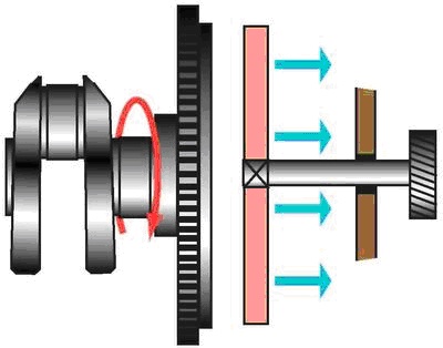 Механизм сцепления представляет собой устройство, в котором происходит передача крутящего момента за счет работы сил трения. Механизм сцепления позволяет кратковременно разъединять двигатель и коробку передач, а затем вновь плавно их соединять. Элементы механизма заключены в картер, сцепления который крепится к картеру двигателя. Механизм сцепления состоит из (см. рис. 35): Ведомый диск, связанный с первичным валом коробки передач, постоянно прижат к маховику нажимным диском под воздействием сильных пружин. За счет огромных сил трения между маховиком, ведомым и нажимным дисками, все это вместе, как единое целое, вращается при работе двигателя. Но это только тогда, когда водитель не трогает педаль сцепления, независимо от того движется его автомобиль или стоит на месте. Для выключения сцепления водитель нажимает на педаль, при этом нажимной диск отходит от маховика и освобождает ведомый диск, прерывая передачу крутящего момента от двигателя к коробке передач (рис. 36). Нажимать на педаль сцепления следует достаточно быстрым, но не резким, спокойным движением до конца хода педали. Рис. 36. Сцепление выключено Для начала движения машины необходимо прижать ведомый диск, связанный с ведущими колесами (через первичный вал коробки передач и другие составляющие трансмиссии) к вращающемуся маховику, то есть включить сцепление (рис. 37). И это сложная задача, так как угловая скорость вращения маховика составляет 20-25 оборотов в секунду, а скорость вращения ведущих колес - ноль. Рис. 37. Сцепление включено Давайте подумаем, как решить эту задачу. Представьте, что вы опоздали на поезд, который уже начал движение. При грамотных действиях сначала вы его догоняете, двигаясь параллельно, затем хватаетесь за поручень, и когда ваша скорость уравняется со скоростью поезда, то можно уже и запрыгивать в вагон. Но вам может присниться кошмарный сон, в котором вы, двигаясь наперерез поезду, пытаетесь сразу попасть в движущийся вагон. Конечно промахиваетесь и не попадаете в больницу только потому, что вовремя просыпаетесь в холодном поту. Зато после этого начинаете всегда правильно отпускать педаль сцепления только в три этапа. На первом этапе работы по включению сцепления - приотпускаем педаль, то есть даем возможность пружинам нажимного диска подвести ведомый диск к маховику до их легкого соприкосновения (догнали поезд). За счет сил трения диск, проскальзывая некоторое время относительно маховика, тоже начнет вращаться, а ваш автомобиль - потихоньку ползти. На втором этапе - удерживаем ведомый диск от какого-либо перемещения в средней позиции в течение двух-трех секунд для того, чтобы скорость вращения маховика и диска уравнялись (ухватились за поручни вагона). Машина при этом немного увеличивает скорость движения. На третьем этапе - маховик вместе с нажимным и ведомым дисками уже вращаются вместе без проскальзывания и с одинаковой скоростью, стопроцентно передавая крутящий момент к коробке передач и далее на ведущие колеса автомобиля (запрыгнули в вагон). Это соответствует состоянию механизма сцепления включено, автомобиль движется. Теперь остается только полностью отпустить педаль сцепления и убрать с нее ногу. Если в начале движения педаль сцепления резко бросить, то автомобиль " прыгнет" вперед, а двигатель заглохнет. В худшем варианте что-ниб