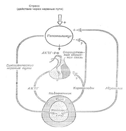 Рис. 2.1.3. Механизмы активации коры надпочечников при стрессе. Кроме глюкокортикоидов в механизмах развития стресс-реакции важную роль играет гормон роста, тиреоидные и др. гормоны, механизмы, секреции которых сходны с таковой глюкокортикоидов (рис.2.1.4).