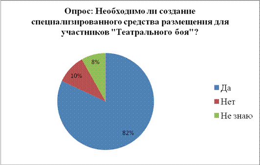 Согласно анализу молодежных мероприятий в области культуры и искусства, которые проводятся в Санкт-Петербурге, мы пришли к выводам, что хостел, рассчитанный на участников и зрителей данных мероприятий, будет востребован. В открытии подобного хостела можно выделить следующие преимущества для участников фестивалей и конкурсов: - Все участники будут размещены в одном месте, следовательно, будут полностью погружены в творческую атмосферу мероприятия. - Руководители групп смогут проживать рядом со своими подопечными, что поможет коллективу сплотиться и получать поддержку руководителя во все время пребывания в Санкт-Петербурге. - Участники и зрители определенного фестиваля или конкурса смогут поближе познакомиться с другими участниками, что создаст крепкие связи между коллективами в будущем и поможет ослабить напряжение от конкуренции во время конкурса. - Так как все участники будут проживать в одном месте, это значительно упростит и удешевит их транспортировку до места проведения фестиваля. - Если фестиваль проводится ежегодно, то участники смогут приезжать каждый год в Санкт-Петербург, не обременяя себя подбором отеля. В Санкт-Петербурге ежегодно начиная с 2007 года проводится соревнование театральных миниатюр молодёжных непрофессиональных театральных студий – «Театральный бой». Нами был проведен опрос участников, зрителей и руководителей этого мероприятия. Было опрошено 50 человек, которые составляют 4 коллектива, приехавшие в Санкт-Петербург из других городов.