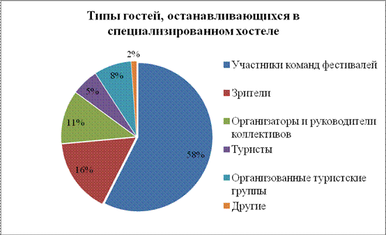 Рис. 2. Типы гостей, останавливающихся в специализированном хостеле Исходя из данных диаграммы, мы также можем сделать выводы касательно количества мест и размера номеров хостела. Чтобы уменьшить стоимость проживания, можно предложить гостям как минимум 6 номеров с шестью местами. Места будут представлять собой двухэтажные кровати. Соответственно, 3 из них будут женскими, 3 – мужскими, либо в другой пропорции, согласно необходимости проживающих. Можно сделать вывод, что в специализированном хостеле будет останавливаться преимущественно молодежь, участвующая в фестивалях и конкурсах, но также хостел будет заполняться необходимым количеством туристов, имеющим другие цели посещения Санкт-Петербурга. Очевидно, что с малым номерным фондом хостел не может предоставлять услуги различным целевым аудиториям, но, тем не менее, справится со своей прямой задачей – разместить участников и зрителей фестивалей Санкт-Петербурга. Концепция проекта: - открытие хостела на 14 номеров, рассчитанного на размещение 60 гостей со средним и низким уровнем достатка. Местоположение: - Санкт-Петербург, Центральный район города. Режим работы хостела: - ежедневно, 24-часовой двухсменный рабочий день. Основные характеристики проекта: - молодежный хостел; - демократичная ценовая политика; - хостел позиционируют себя как отель с арт-наполнением (проведение мероприятий с приглашенными гостями, фото выставками, творческой гостиной); - хорошая транспортная и шаговая доступность (расположение вблизи центра города, в пешей доступности от Невского проспекта – главной улицы Санкт-Петербурга). Номерной фонд (14 номеров): - 6 номеров – шестиместное размещение; - 4 номера – четырехместное размещение; - 4 номер – двухместное размещение; Услуги: - кухня общего пользования; - гостиная общего пользования - 3 санузла общего пользования; - услуги связи и Интернет; - проживание в номерах. Дополнительные сервисы: - предварительный заказ номера; - организация трансфера до места проведения мероприятий и для экскурсий; Черты потребительского поведения целевых клиентов хостела: ограниченность в материальных ресурсах, социальный статус (преимущественно) – студенты, иногородняя молодежь, их руководители или просто одинокие путешественники, имеющиесклонность к общению и новым знакомствам, предпочитающие вращение в творческом обществе. Специфика хостела: - основной доход хостела будет поступать от предоставления средств размещения в краткосрочное пользование; - тарифы, установленные за размещение на ночь, включают в себя койко-место и постельное белье, предоставляемые хостелом (тарифы могут изменяться в зависимости от сезона: высокий/низкий);