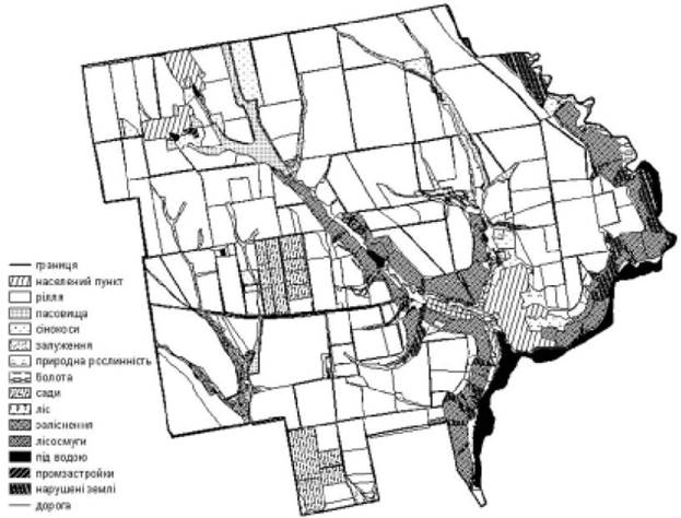 Рис.3. Фрагмент грунтової цифрової карти сільськогосподарських підприємств. Далі створюється електронна геоморфологічна карта на основі цифровування топографічної основи з отриманням тривимірної цифрової карти рельєфу або автоматично із застосуванням векторизаторів, що оцифровують відскановану з кальки сітку контурів. Топографічна векторна карта СТОВ «Авіатор» Городенкіцвського району була отримана в процесі автоматичної векторизації ізоліній рельєфу топографічної карти у програмі Easy Trace. На початковому етапі дослідження агро-ландшафтів сільськогосподарського підприємства і надалі для їх проектування створеним картографічним джерелом є карта розповсюдження грунтових ареалів. Грунтова карта стає основою для складання агроекологічної і агроландшафтної карти. За межами грунтових ареалів, а також їх гранулометричному складу. Куту нахилу і сонячній експозиції виділяють агроекологічно однорідні ділянки. Метою виділення агроекологічно однорідних ділянок є підбір культур з урахуванням їх взаємодії (продукційної, фітомеліоративної, фітосанітарної) для виявлення умов життєзабезпечення рослин в межах поля і робочої ділянки, виключення негативного впливу просторової мінливості (мозаїчності) агроекологічних умов на продуктивні властивості земель і на технологію обробітку культур. Основна інформація формується в процесі грунтово-ландшафтного картографування земель, що виконується за матеріалами аерофотознімання, топографічних карт і даних спеціальних польових і лабораторних досліджень. Результати досліджень представляються пошарово у вигляді електронних карт форм і елементів мезорельєфу, крутизни схилів, їх експозиції, мікрорельєфу, грунтоутворюючих порід, гідрогеологічних умов, ерозії грунтів, структур грунтового покриву тощо. Кожна електронна карта має базу даних, що містить, відповідно до тематики карти, інформацію по кожному контуру. Наприклад, база даних електронної карти мікроструктур грунтового покриву може містити таку наступну інформацію: номер контура; індекс грунтової комбінації; повна назва грунтової комбінації; співвідношення грунтів, ступінь складності і контрастності, положення в геохімічному ландшафті, геохімічні бар’єри, агроекологічні параметри грунтів. Всі електронні карти мають єдину систему координат, прив’язану до відсканованої топографічної основи масштабу 1: 10000. Кількість електронних тематичних карт-шарів залежить від складності ландшафтно-екологічних умов і рівня інтенсифікації виробництва. Шляхом взаємного накладення тематичних електронних карт-шарів формується комплексна карта агроекологічних груп і видів земель, тобто елементарних ареалів агроландшафта (ЕАА), кожен з яких забезпечується банком даних агроекологічної оцінки (теплозабезпеченість, вологозабезпеченість, показники рельєфу, грунтового покриву тощо). Спочатку виділяють групи земель за умовами рельєфу, накладаючи на грунтову карту цифрову карту розподілу схилів за кутом нахилу; потім накладають карти перезволожених і солонцевих земель, виділяючи групи за ступенем перезволоження і ступенем розвитку солонцевого процесу. Аналогічно можуть виділятися групи засолених, літогенних й інших земель. Далі, використовуючи карти еродованих, перезволожених, солонцевих земель, карти розподілу схилів за ф