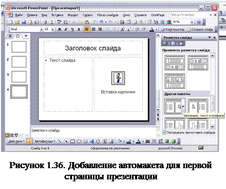 ЗАДАНИЕ 1 Создание и оформление презентации Цель работы: ознакомиться со структурой и основными возможностями редактора презентаций, изучить структуру слайда и способы его отображения при редактировании, ознакомиться со способами оформления слайдов и с основными объектами оформления. Форма отчета: Выполнение зачетного задания. Задание 1. Создайте пустую презентацию. Методика выполнения 1. Пуск-Программы- Microsoft office- Microsoft Power Point. 2. Выберите автомакет первой страницы Текст и графика (рисунок 1.36). Вставка |Создать слайд |Разметка слайда |Другие макеты |Заголовок, текст и графика.