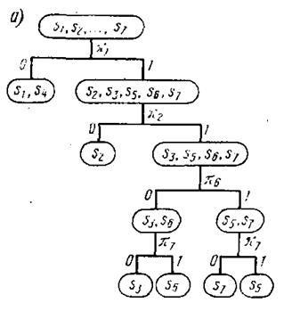 В этом случае поиск неисправного элемента требует выполнения всего множества проверок, включенных в тест, с фиксацией их результатов. На основе анализа полной совокупности этих результатов делается вывод о месте неисправности. Безусловный алгоритм с условной остановкой целесообразно представлять в виде графа. Граф моделирует алгоритм поиска неисправности по табл. Корневая вершина графа представляет множество S всех рассматриваемых технических состояний системы, а остальные вершины — подмножества состояний, выделяемые в результате деления множества S и его подмножеств но результатам элементарных проверок. Висячие вершины соответствуют подмножествам эквивалентных состояний. Исходящими из вершин дугами изображаются элементарные проверки, а заходящими дугами — результаты этих проверок. Заданный алгоритм предусматривает подачу проверок в фиксированной последовательности — п1 п2...п6 п7. Однако выполнение алгоритма может быть остановлено на любом этапе, если выделилось подмножество состояний, соответствующее висячей вершине. Так, на первом этапе при выполнении проверки д, получение результата 0 останавливает алгоритм, так как выделено подмножество эквивалентных состояний {s1s4) В противном случае применяют проверку л2 и алгоритм продолжается.